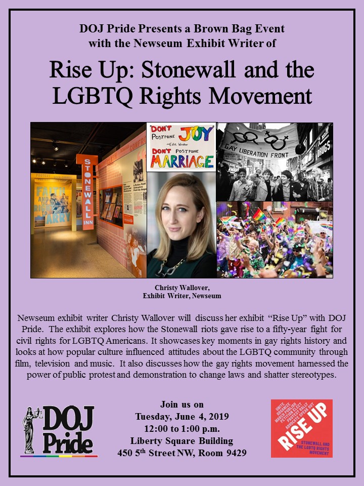 In honor of the 50th anniversary of the Stonewall Riots and Pride Month, DOJ Pride will be hosting a brown bag discussion with Newseum exhibit writer Christy Wallover. The event will take place on June 4, 2019, from 12:00 pm to 1:00 pm in the Liberty Square Building, located at 450 5th St., NW, Room 9429.