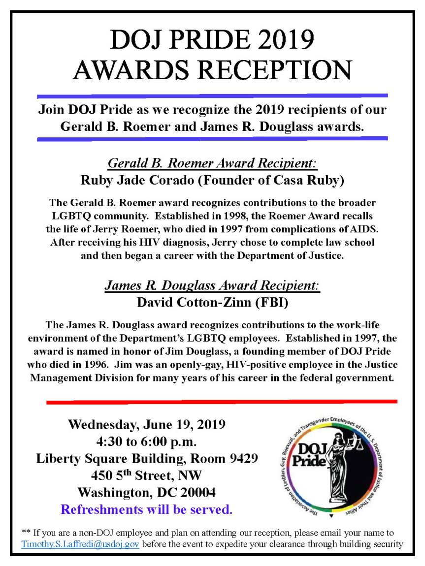 Join DOJ Pride as we recognize the 2019 recipients of our Gerald B. Roemer and James R. Douglas awards. The event will be held on Wednesday, June 19, from 4:30 PM to 6:00 PM in Room 9429 in the Liberty Square Building (450 5th St NW).