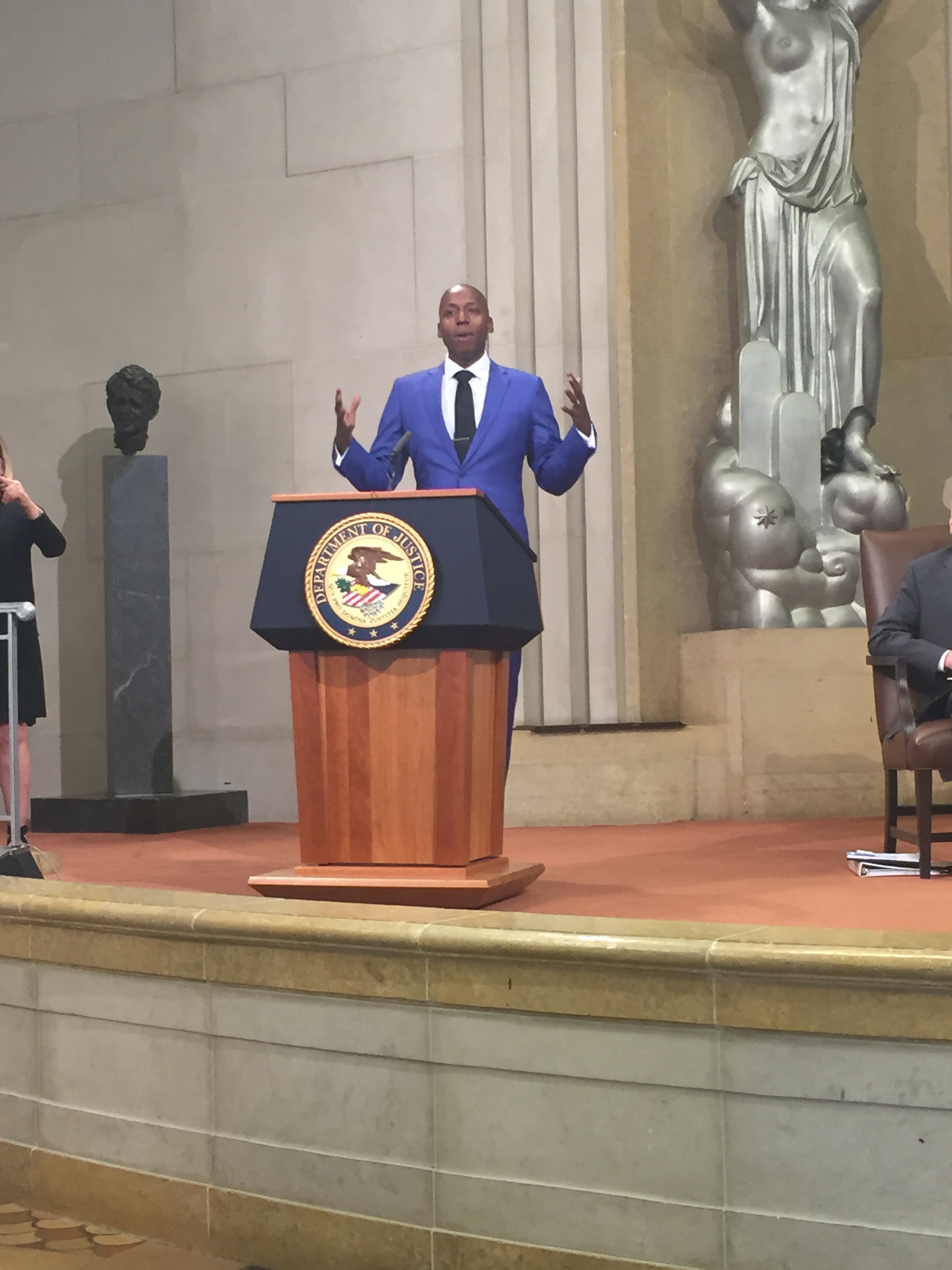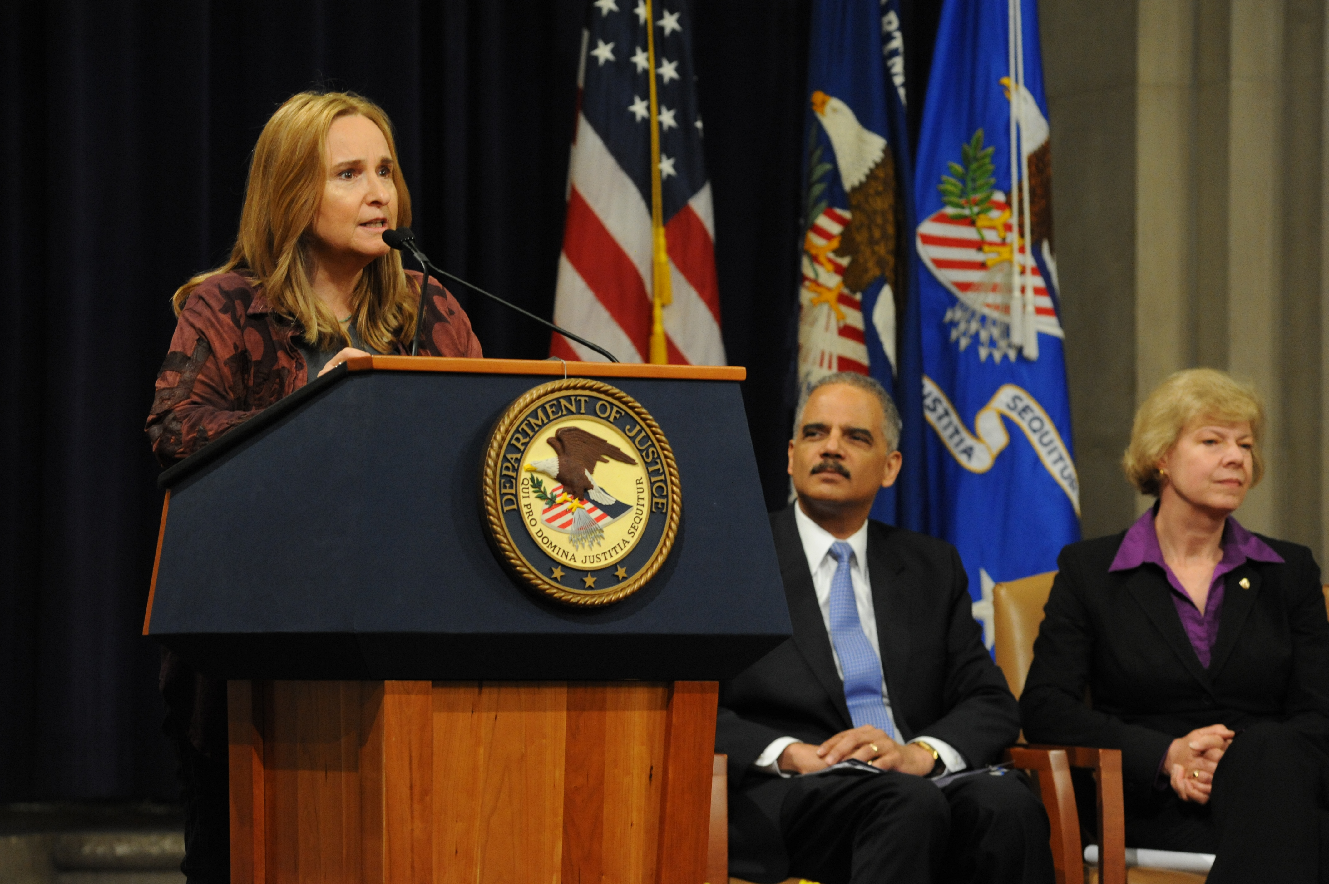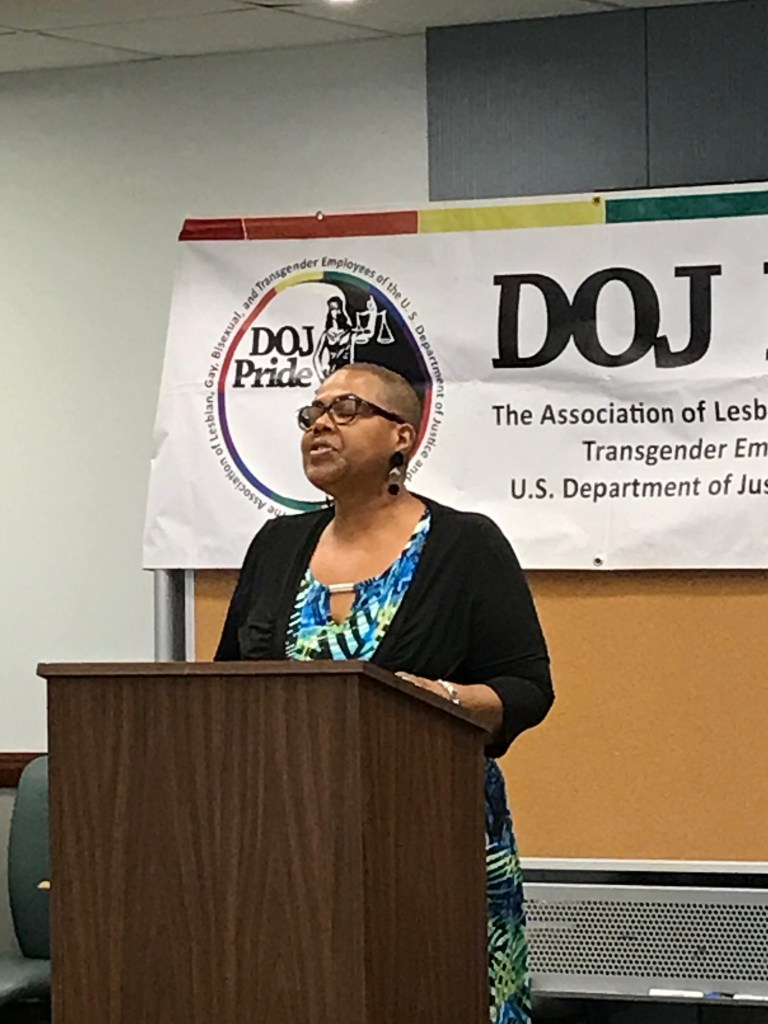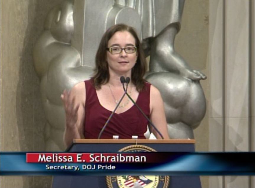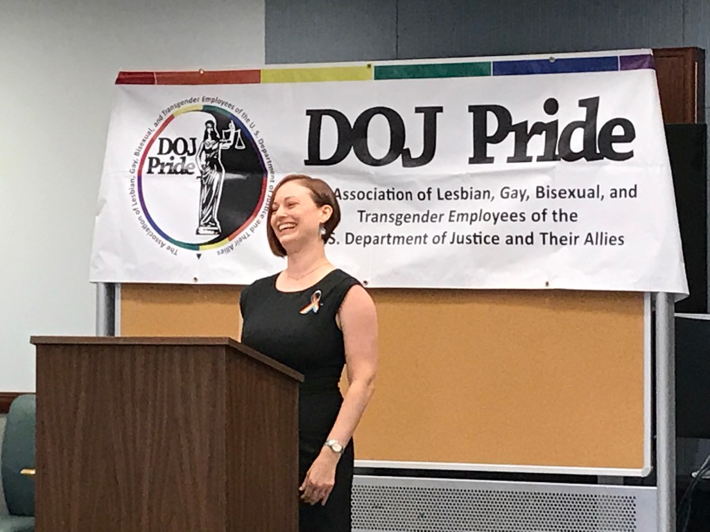 DOJ Pride Secretary Melissa E. Schraibman presenting the DOJ Pride Awards at the Department’s LGBTQ+ Pride Month observance on June 6, 2011