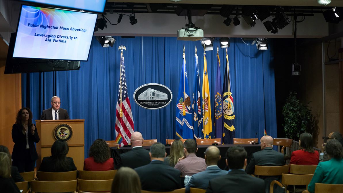 On October 24, 2019, DOJ Pride collaborated with the FBI, JMD, and EOUSA to present an LGBTQ+ History Month program at the Main Justice building in Washington, DC. The program focused on a team of FBI employees who were deployed to Orlando, Florida in 2016 to serve as liaisons to help survivors, family members, and loved ones heal after the Pulse nightclub shooting. ATF Acting Deputy Director Regina Lombardo delivered keynote remarks. The panel discussion provided an inspiring look back at outreach efforts led by LGBTQ+ Department employees that aided the healing process for a community in mourning. The event was broadcast live on JTN (Justice Television Network). Photographer: Eli Alford