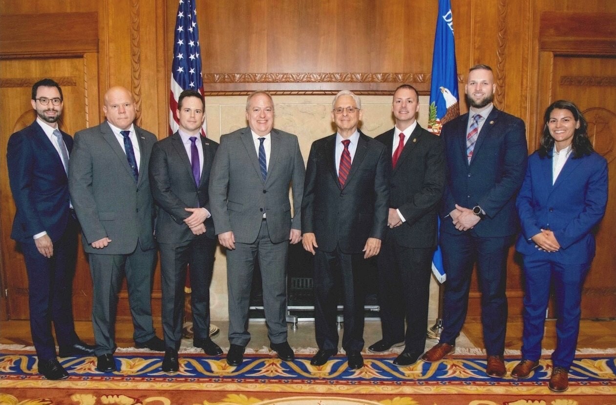 June 27, 2023: Attorney General Merrick Garland with the DOJ Pride board (L to R) Gustavo Ruiz, Dalton Baker, Eric Ashby, David Heath, President Adam Stickler, Dillon Phillips, and Amanda Viteretti